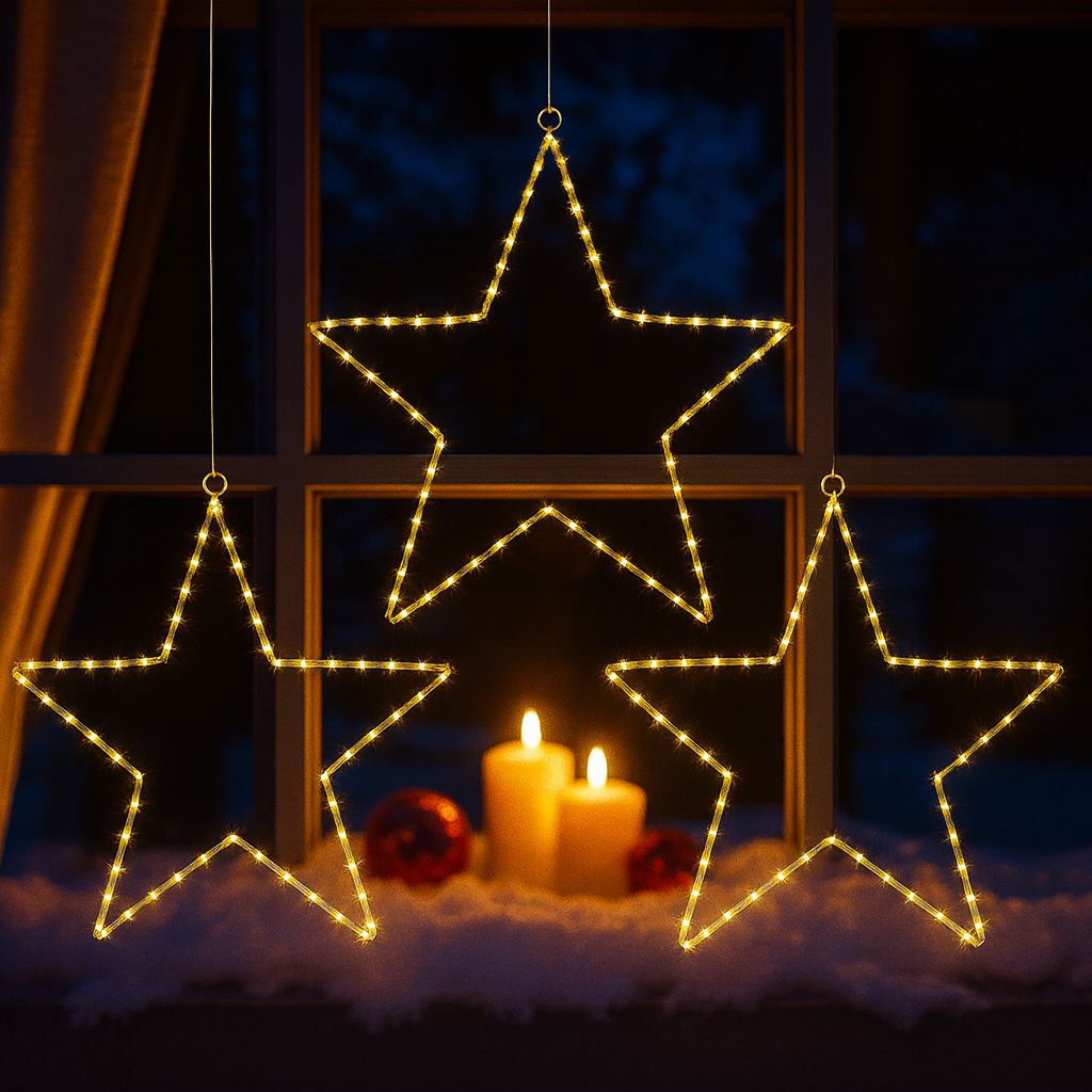 Der elegante Stern aus hochwertigem Metall erzeugt ein warmweißes Leuchten und eignet sich perfekt für Fenster, Wohnräume, Partys, Hochzeiten, Gärten oder weihnachtliche Dekorationen.