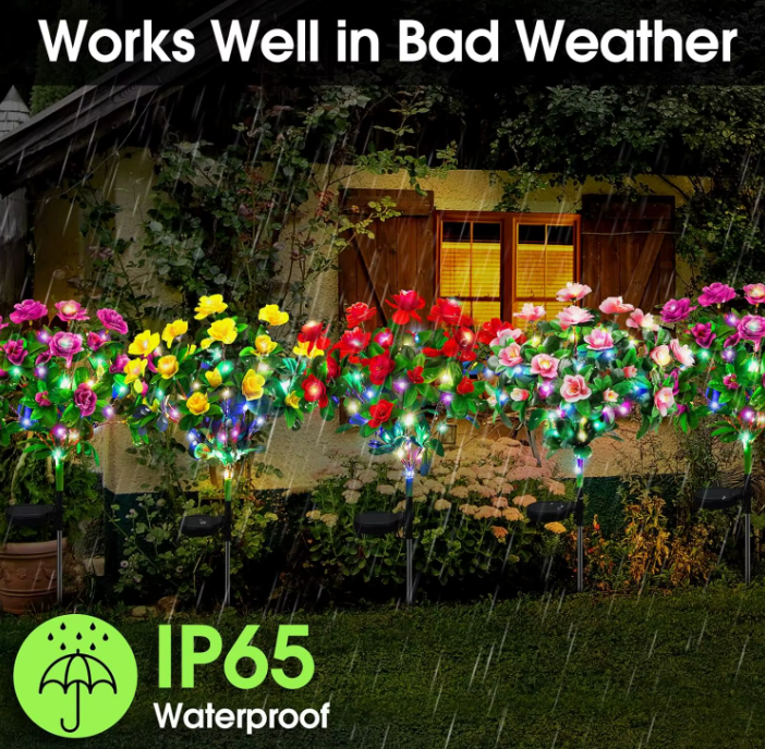 Die Leuchte ist mit 56 bunten LED-Leuchten ausgestattet, die entlang der Stängel angeordnet sind und für eine gleichmäßige Lichtwirkung sorgen. Die Solarblumen sind in vier Farben erhältlich: Rot, Gelb, Lila und Rosa. Tagsüber lädt sich das integrierte Solarpanel auf, während sich die Beleuchtung bei Dunkelheit automatisch einschaltet. Bei vollständiger Ladung beträgt die Leuchtdauer bis zu 8 Stunden, abhängig von Sonneneinstrahlung und Wetterbedingungen.